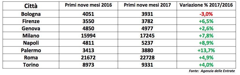 Tempo di bilanci anche per il mercato immobiliare per il 2017 che si avvia verso i suoi giorni conclusivi. Diramati dall’Agenzia delle Entrate i dati sulle compravendite dei primi nove mesi del 2017 e la crescita, anche se rallentata, è confermata. Si conferma quindi, dal lato delle transazioni, l’uscita dalla crisi con un incremento del 4,5% rispetto allo stesso semestre del 2016.