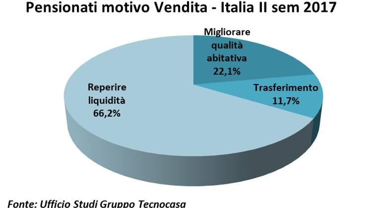 Il 27,3% di coloro che hanno venduto casa nel secondo semestre del 2017 è un soggetto in pensione e il 66,2% ha venduto per reperire liquidità, il 22,1% per migliorare la qualità abitativa e l’11,7% per trasferirsi in un altro quartiere o in un’altra città.