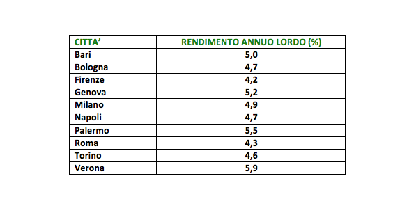 La curva dei prezzi è stata calcolata facendo riferimento alle variazioni degli immobili per quanto riguarda il compravenduto della tipologia “medio usato” (immobili con caratteristiche e finiture non di particolare pregio ma neppure economiche e con più di 10 anni di età). L’andamento delle variazioni dei canoni di locazione nel tempo è stato elaborato sulla tipologia immobiliare del bilocale. Tra le grandi città quelle che hanno il rendimento annuo lordo da locazione più elevato sono Verona (5,9%) e Palermo (5,5%).
