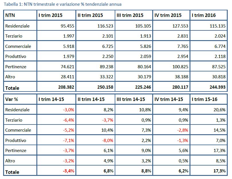 D’altra parte, nella nota trimestrale pubblicata dall’Osservatorio del mercato immobiliare (Omi) dell’Agenzia delle entrate si legge, infatti, che “nel primo trimestre del 2016 il mercato immobiliare italiano mostra un inaspettato aumento del tasso di variazione tendenziale delle unità immobiliari compravendute nel settore residenziale e in quello commerciale e comunque una crescita generalizzata in tutti i settori. La ripresa manifestata nel corso del 2015 imprime una netta accelerazione nei primi tre mesi del 2016. Tra gennaio e marzo 2016 il numero complessivo di Ntn (Numero di transazioni normalizzate, ndr) supera infatti le 244 mila unità, facendo registrare un + 17,3 % rispetto allo stesso periodo dell’anno precedente.