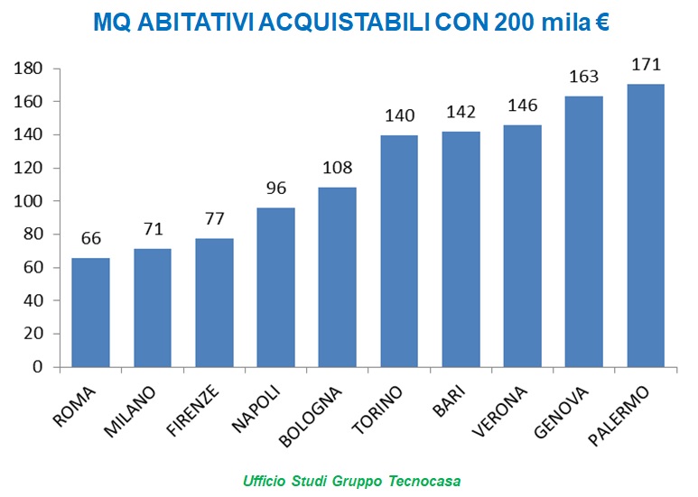 A Roma si possono acquistare 66 mq, a Milano qualcosa in più ma non sopra i 71 mq. Sono queste le metrature che potreste ottenere con un budget di 200mila euro a disposizione.