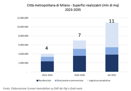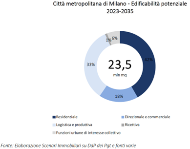 Complessivamente gli ambiti di riqualificazione edilizia e rigenerazione urbana della Città metropolitana di Milano interessano una superficie di quasi 50 kmq, in grado di generare potenzialmente una superficie lorda di 23,5 milioni di mq, concentrata per poco più del 40 per cento in funzioni urbane di natura residenziale (9,8 milioni di mq) e per poco più di un terzo logistico-produttiva (7,9 milioni di mq). Le potenzialità di sviluppo relative al settore residenziale e alle diverse attività economiche permetteranno, le prime di offrire una nuova abitazione a quasi 200 mila abitanti teorici, pari a poco meno di 90 mila nuclei familiari, le seconde di ospitare poco più di 100 mila posti di lavoro. Si stima un impatto sul mercato immobiliare di circa 50 miliardi di euro di valore aggiunto, concentrato per due terzi nel comparto residenziale.