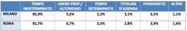 Come ampiamente ipotizzabile, gli istituti di credito tendono a finanziare maggiormente i soggetti che hanno redditi certi: i lavoratori a tempo indeterminato rappresentano l’85,9% a Milano e l’81,7 a Roma, mentre i pensionati costituiscono rispettivamente il 2,5 e il 3,9%.