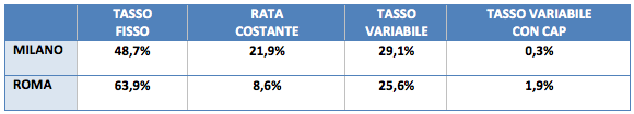 Nelle due principali città italiane la tipologia di mutuo preferita è a tasso fisso: Milano si ferma al 48,7%, mentre Roma arriva al 63,9%. La seconda scelta è il tasso variabile, che incide per il 29,1% nel capoluogo lombardo e per il 25,6% nella Capitale.