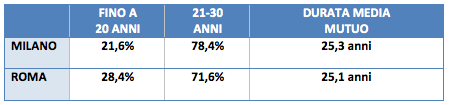 Nel 2015, sul territorio nazionale, la durata media del mutuo è stata di circa 24 anni e mezzo. Milano e Roma si discostano solo leggermente dalla media nazionale, in