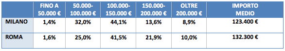 Segmentando il campione per fasce di erogato, si nota come a Milano e Roma vengano finanziati maggiormente mutui di importo medio, compresi tra 100 e 150.000 €: la percentuale è di poco superiore al 44% a Milano, mentre Roma incide per il 41,5%. Si evidenziano differenze sugli importi delle altre classi: mutui di valore inferiore a 100.000 € si erogano maggiormente a Milano, quelli oltre 150.000 € a Roma.