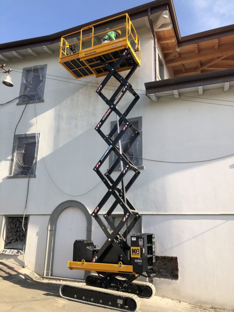 Elevo-Kiloutou | Cantiere per tinteggiare un palazzo a Bergamo Alta. Utilizzato il mini scissor BiBi 1090 BL Evo.