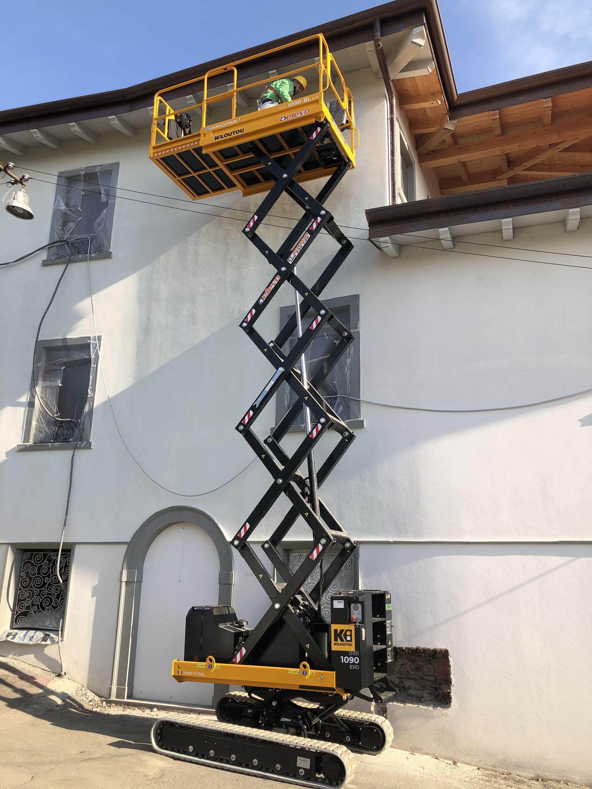 La piattaforma Bibi 1090 BL Evo, mini scissor di AlmaCrawler del parco noleggio di Elevo-Kiloutou, grazie alla trazione cingolata e al livellamento automatico, consente di lavorare in spazi ridotti, pendenze sino a 20 gradi e terreni accidentati.