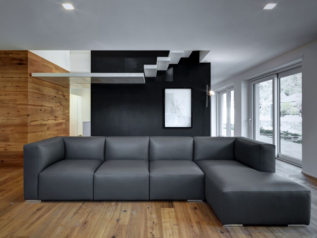 Ad occuparsi della ristrutturazione è stata un’impresa edile di Sondrio, ed è lo stesso titolare Mirko Marveggio a spiegare le difficoltà incontrate durante il cantiere “I vincoli principali erano l’impossibilità di modificare radicalmente l’aspetto esterno, le quote pavimento e il carico strutturale delle solette. Li abbiamo affrontati realizzando aperture sfruttate al massimo, installando gran parte degli impianti a parete e realizzando la scala con una struttura in ferro e cartongesso per alleggerirla al massimo, garantendone però la resistenza”. Le pedate, per evidenziare proprio questa sensazione di sospensione, sono bianche e spiccano contro la superficie scura della parete.
