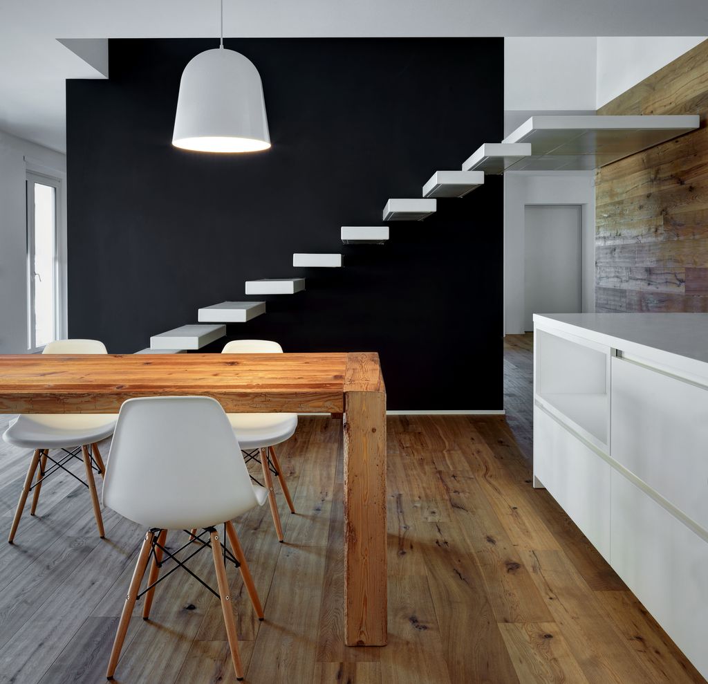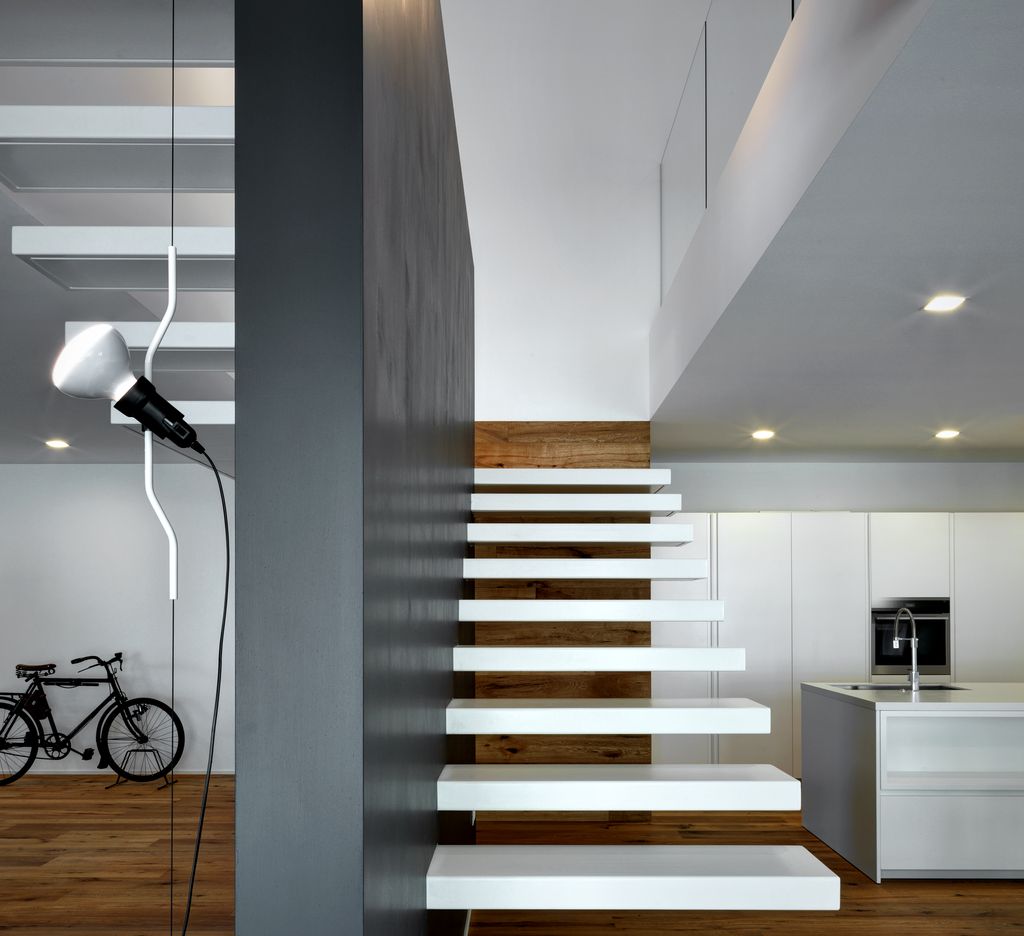 La scala, realizzata artigianalmente da Claudio Gatti di Bbg, è formata da pedate a sbalzo in ferro verniciate di colore bianco mentre la parete, che svolge anche funzione portante, è stata tinteggiata di color scuro sottolineando l'effetto di “galleggiamento” delle pedate a sbalzo. A terra sono posate doghe di legno in essenza di rovere piallato anticato e oliato (foto di Marcello Mariana)