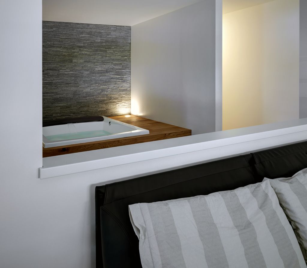 La camera da letto matrimoniale si affaccia, attraverso un’apertura direttamente sul bagno (foto di Marcello Mariana)