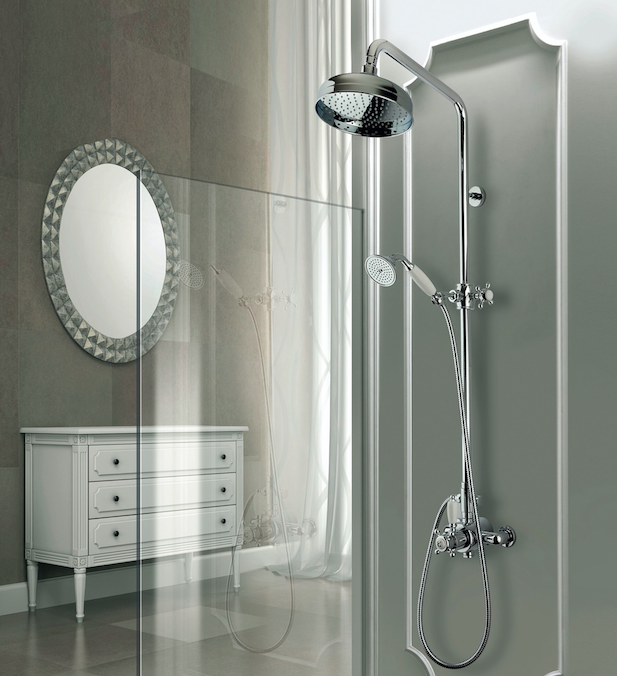 Ne sono esempio, la serie Vivaldi, caratterizzata da forme affusolate e tondeggianti che ben rappresentano l’essenza della classicità nella proposta per lavabo così come nella colonna doccia, con il soffione a campana.