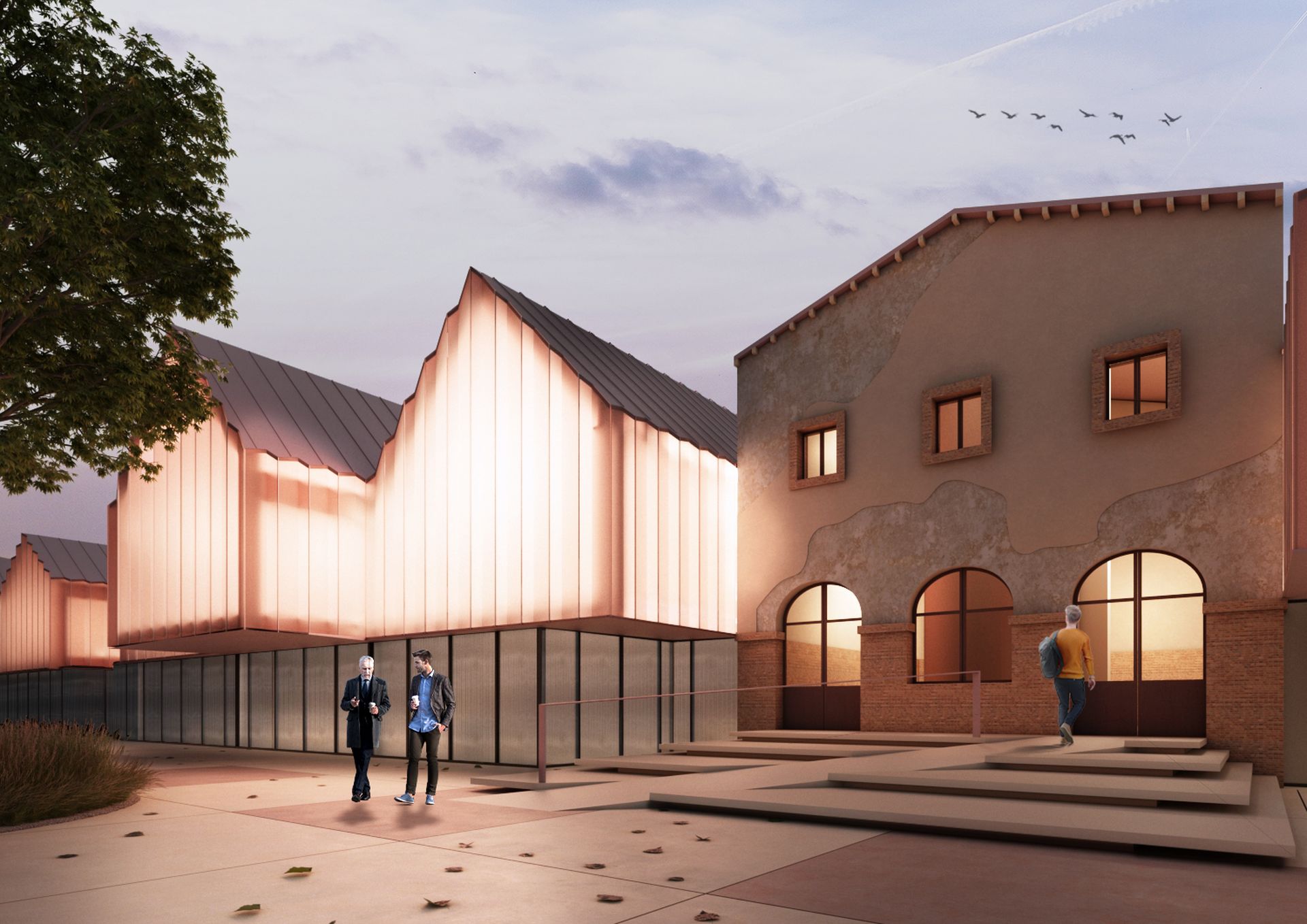 I nuovi edifici, che si andranno a rapportare con il corpo di fabbrica centrale esistente con copertura a falde, riprendono questa caratteristica andando a creare un nuovo elemento che contraddistingue il paesaggio. Una serie di volumi con tetti a falde aventi varie inclinazioni si agganciano al corpo in mattoni, memoria del preesistente.