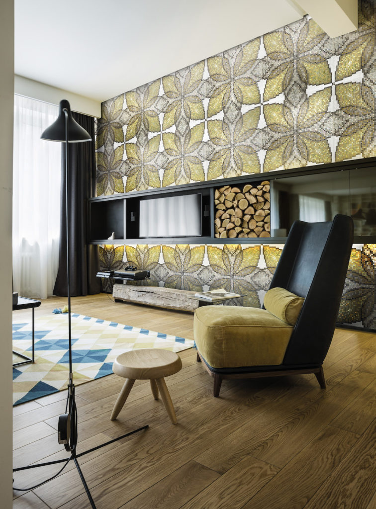 Giochi di sfumature, forme e colori, decori lievi ispirati alla natura ma in bilico tra realtà e fantasia, che rappresentano un mondo primordiale e fantastico dove la luminosità del mosaico rende unici gli spazi del’abitare.