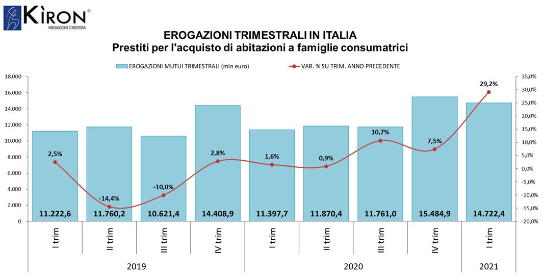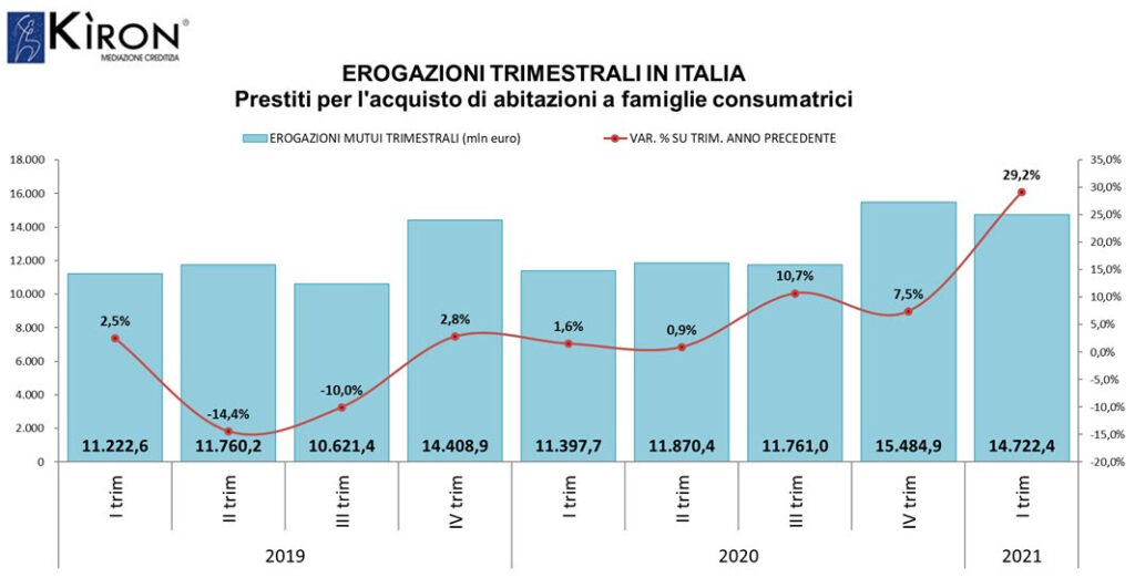 Nel primo trimestre 2021 le famiglie italiane hanno ricevuto finanziamenti per acquistare un’abitazione per 14.722 milioni di euro, rispetto al medesimo trimestre del 2020 si registra un +29,2% delle erogazioni per un controvalore di oltre 3.3 miliardi di euro.