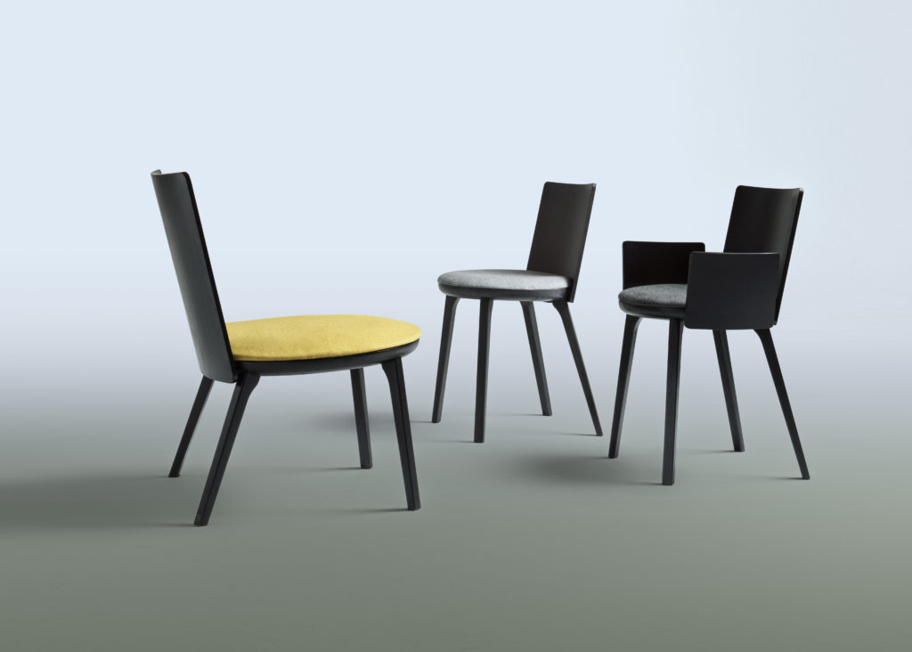 Tre diverse versioni tutte con struttura in frassino massello laccato a poro aperto e morbida seduta in gomma poliuretanica e fodera in fibra di poliestere che condividono lo stesso pensiero progettuale. Nella versione più ‘pura’, la seduta diventa un cerchio perfetto che si interseca con lo schienale, quadrato e leggermente curvo; nella variante Comfort, invece, Riquadra si arricchisce di braccioli che riproducono rettangoli dagli angoli stondati. A completare la famiglia, il modello Relax, una poltroncina lounge senza braccioli con dimensioni più ampie rispetto alle altre due versioni. La scocca circolare larga 60 cm esorta al comfort, così come lo schienale, spazioso e accogliente.
