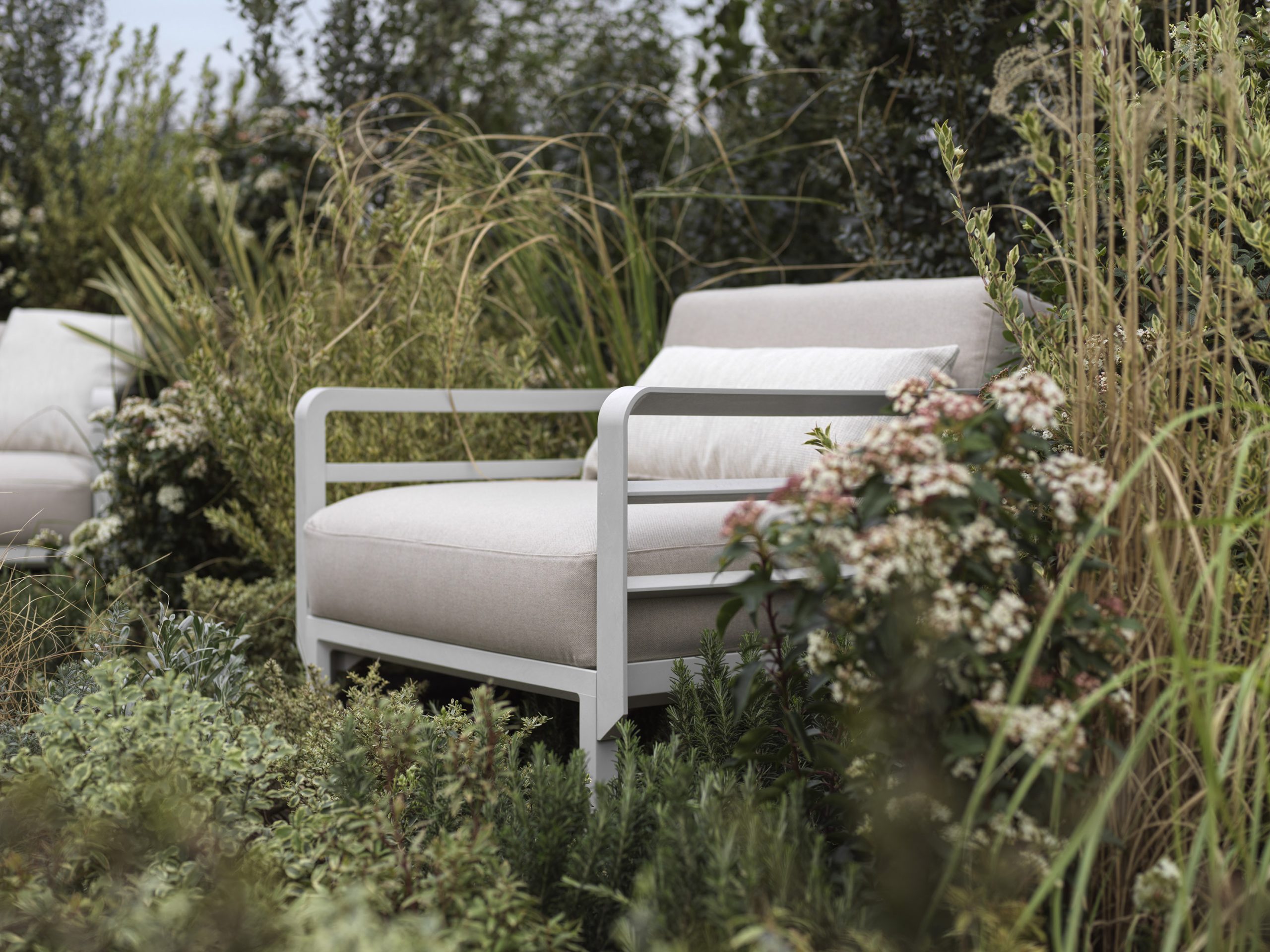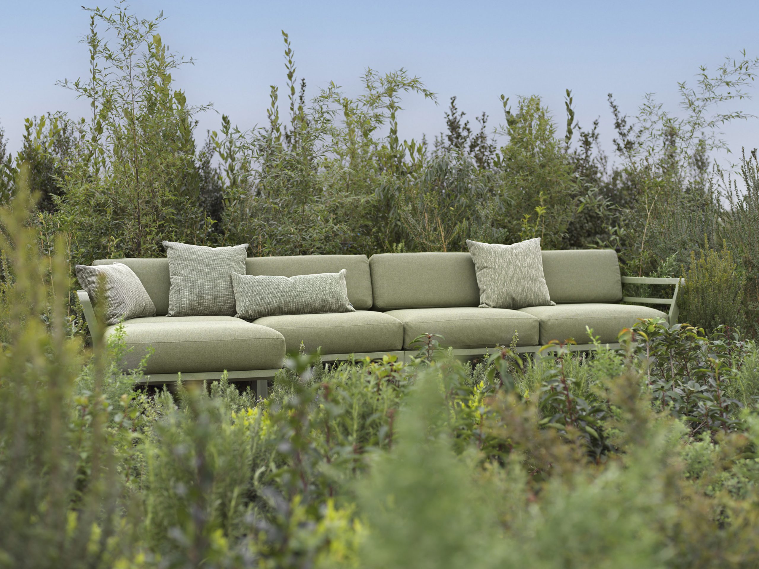 I cuscini autocentranti, realizzati con tessuti di alta qualità tecnica, sono sia resistenti alle intemperie sia lavabili, offrendo quattro raffinate tonalità e abbinamenti cromatici per personalizzare e ammorbidire esteticamente il divano. Inoltre, la collezione Maximo include un tavolino dogato e un porta-oggetti, entrambi realizzati in plastica riciclata.