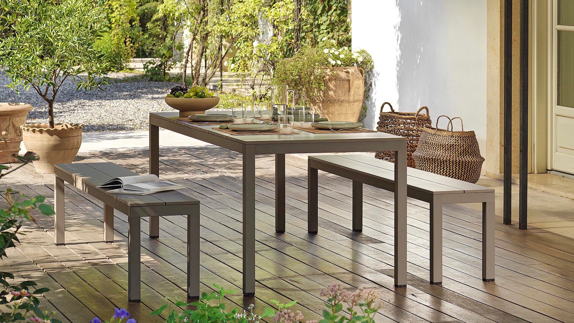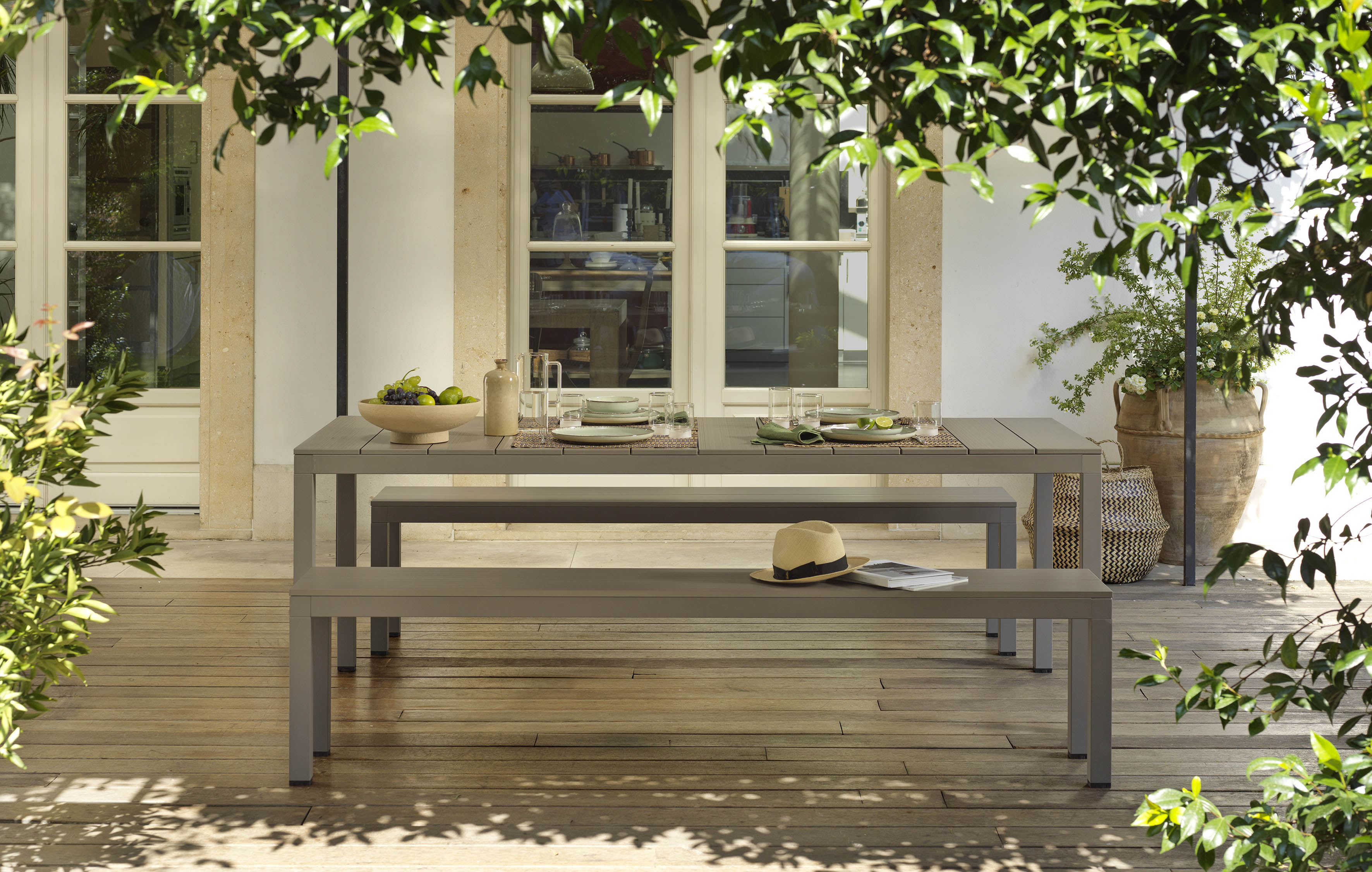 L’arredo da esterno che comprende il tavolo Rio ALU 210 Fix e due panche abbinate Rio Bench ALU. Tavolo e panche sono caratterizzati dal design dogato del piano tavolo e della seduta, realizzati in alluminio verniciato dalla peculiare texture leggermente righettata.