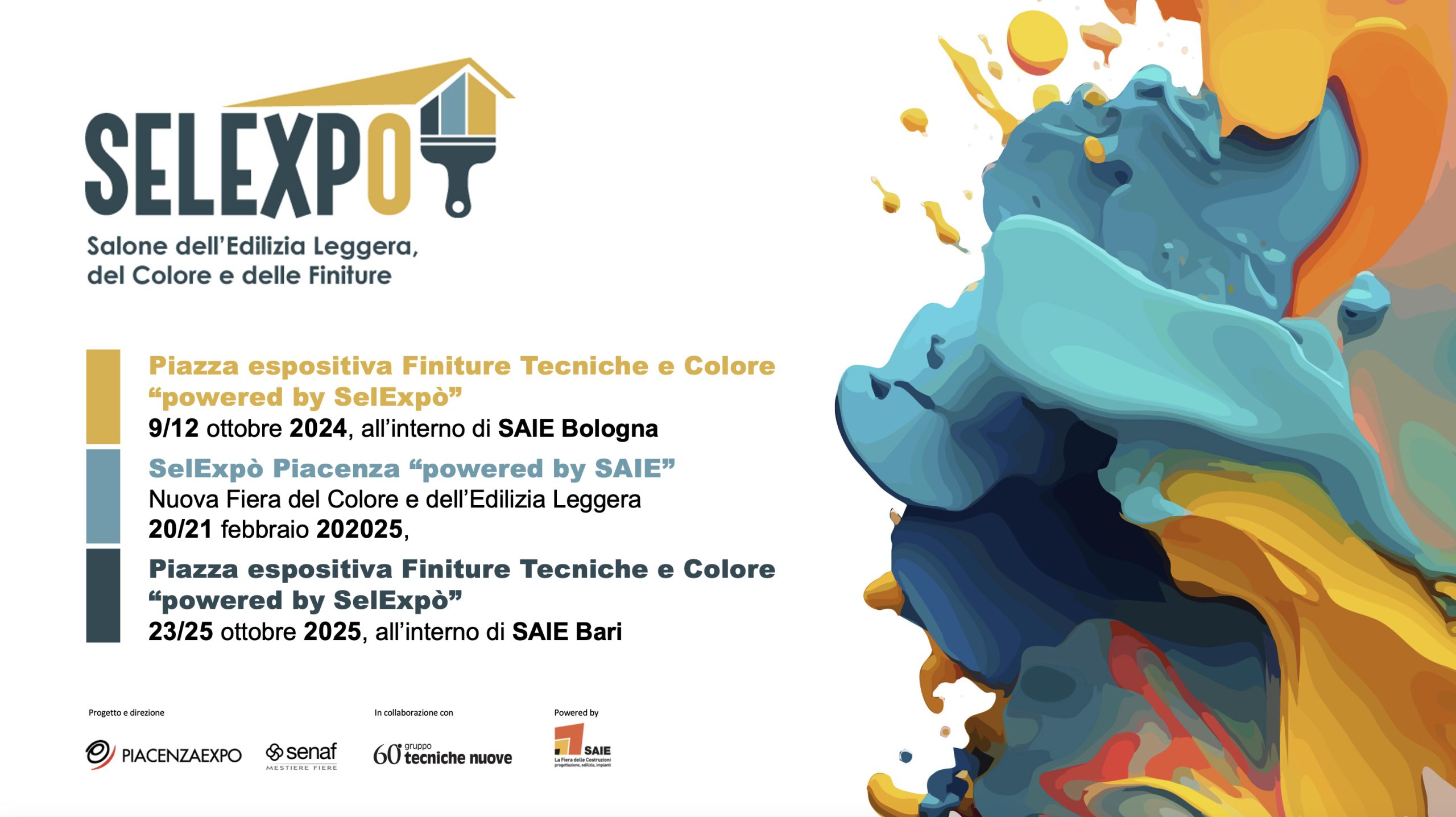 Successivamente, SelExpò si sposterà a Piacenza il 20 e 21 febbraio 2025, con SelExpò Piacenza “powered by Saie”, la prima edizione della nuova fiera del colore, dell’edilizia leggera e delle finiture, organizzata proprio da Piacenza Expo e Senaf. Infine, dal 23 al 25 ottobre 2025, SelExpò farà ritorno a Saie, stavolta all’interno dell’appuntamento di Bari, con un’altra edizione della Piazza Espositiva Finiture Tecniche e Colore “powered by SelExpò”, continuando così il percorso di visibilità e innovazione nel settore del colore e delle finiture tecniche.