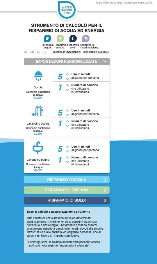 La gamma di prodotti Pcw trasforma con rapidità i rubinetti in dispositivi water and energy saving. Questa gamma è disponibile in differenti modelli. CW-01 è indicato per i tubi della doccia; PCW-02 è l’ideale per le maniglie della doccia e per i soffioni a parete; PCW-02 versione LP, è un prodotto specifico per ottimizzare il flusso anche in condizioni di bassa pressione (da 0.2 fino a 4 bar). Neoperl ha realizzato uno strumento per valutare l’uso dei propri dispositivi water and energy saving. Inserendo i dati richiesti è possibile calcolare l’effettivo risparmio di acqua ed energia e quindi di valutare il reale vantaggio economico.