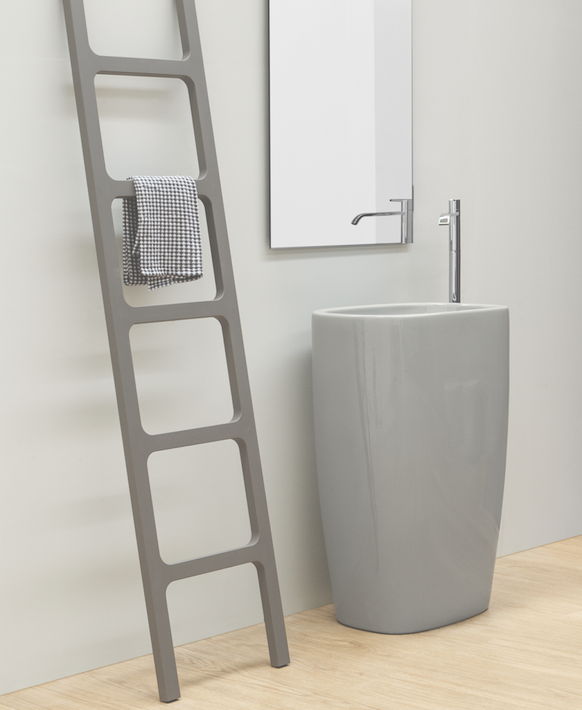 Ispirata alla classica e semplicissima scala a pioli, Oltre è una scala porta asciugamani e porta oggetti che si appoggia a parete. Pensata per il bagno, ma inseribile con versatilità anche in altri ambienti della casa, è coordinata e coerente con le altre collezioni di arredo bagno Nic Design.