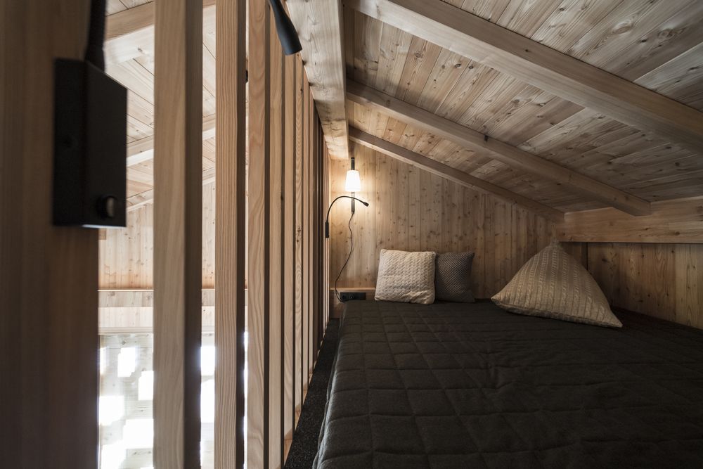 L’intervento, firmato da noa*, ha aggiunto 24 camere nei nuovi mini chalet, camere che si aggiungono 13 già disponibili nel corpo centrale del rifugio. Gli chalet sono sempre in coppia. Ogni chalet ha solo quattro camere, non collegate, a cui si accede da un corridoio di distribuzione comune. La privacy è così garantita.