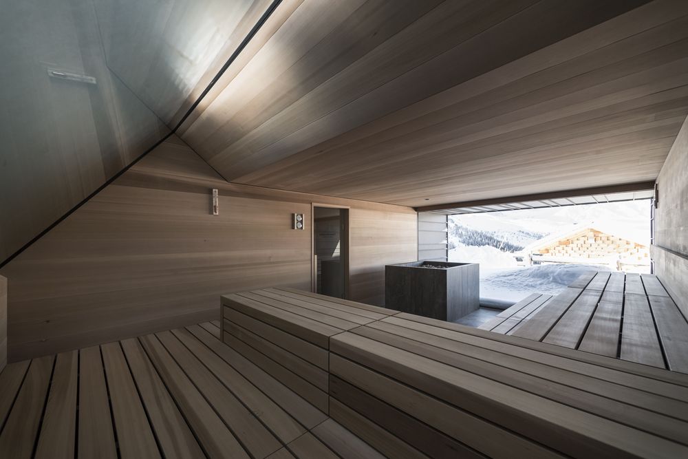 Sorge al posto del preesistente fienile, come edifico autonomo. Si salda a una struttura in lamiera che ospita la sauna, un ambiente di grande suggestione dal punto di vista spaziale. Si affaccia, infatti, con due ampie finestre sul paesaggio: la prima guarda verso la valle; la seconda si apre sul monte Sassopiatto, con un’inclinazione di 45 gradi (per consentire alla neve, in occasione delle abbondanti nevicate invernali, di defluire alla base dell’infisso lasciando libera la vista). Un’area relax con una piccola distribuzione di bevande calde e fredde, completa l’offerta dei servizi, aumentandone il confort.