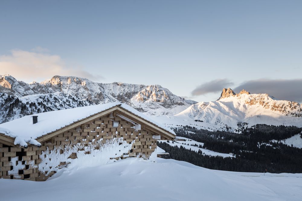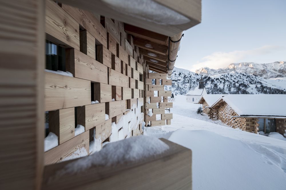Anche nel disegno dei nuovi chalet, noa* ha voluto recuperare in chiave moderna le forme tradizionali degli alpeggi altoatesini. In particolare, i rivestimenti esterni che avvolgono gli chalet sono realizzati con blocchi di legno massello appoggiati l’uno all’altro in un’alternanza di pieni e vuoti che diventa il motivo dominante del nuovo insediamento.