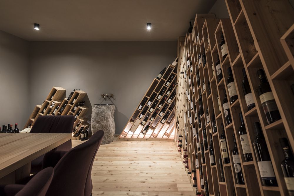 Il disegno ricorda le vette delle montagne che s’innalzano verso il cielo: le scaffalature lignee, infatti, creano una sorta di libreria, caratterizzata da montanti inclinati e da vani allungati che accolgono le singole bottiglie divino (la raffinata scelta delle etichette è curata personalmente dal proprietario-sommelier).