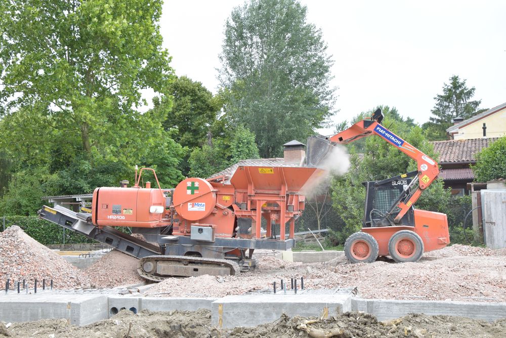 Il minifrantoio ha permesso d’incrementare l’efficienza della benna frantumatrice montata sull’escavatore Jcb che, per sua natura, ha portate limitate e soprattutto può operare solo a demolizione avvenuta in sostituzione della benna tradizionale. L’utilizzo del minifrantoio, invece, è potuto avvenire contemporaneamente all’esecuzione delle demolizioni, accelerando i tempi di recupero delle macerie di risulta, riutilizzate successivamente all’interno del cantiere stesso.