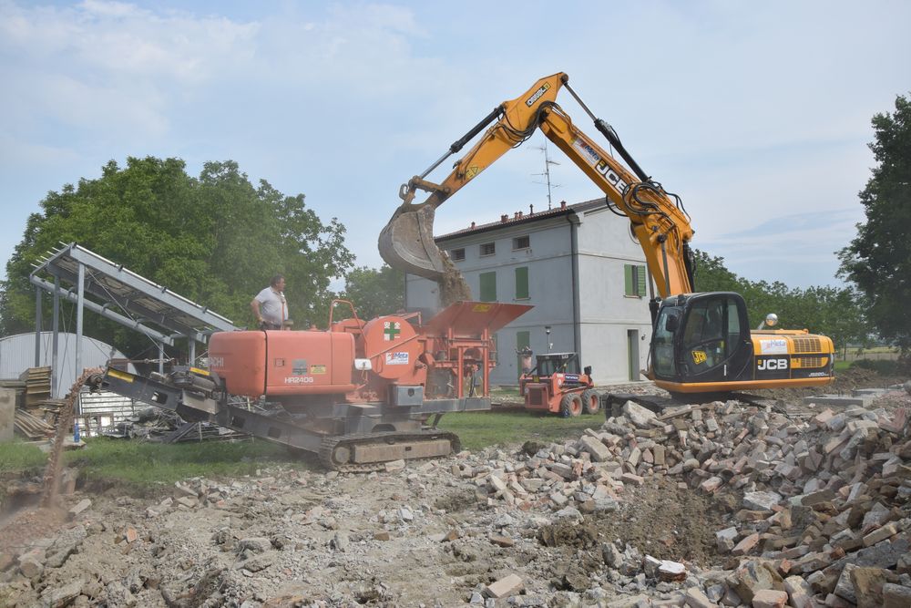 Il minifrantoio e il nebulizzatore, infatti, sono stati utilizzati a servizio dell’escavatore cingolato Jcb, reale esecutore delle demolizioni ed a sua volta dotato di benna frantoio, per ottimizzare lo smaltimento delle macerie di risulta.