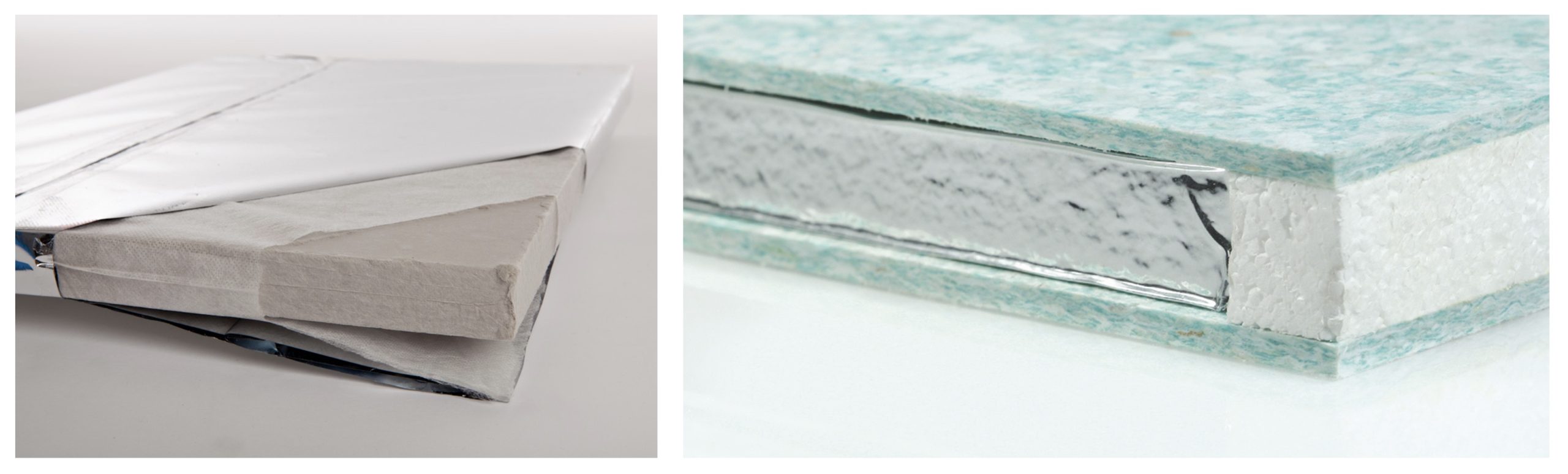 L’insieme crea un pannello rigido, con pressione interna pari a pochi millibar e prestazione termoisolante almeno 8 volte superiore rispetto ai materiali tradizionali. La conducibilità termica λ è infatti pari a 0,0043 W/mK (λ effettivo = 0,007 W/mK considerando l’eventuale accostamento impreciso dei pannelli): con uno spessore di soli 2 cm la trasmittanza media U è pari a 0,239 W/m2K (16 cm di eps).