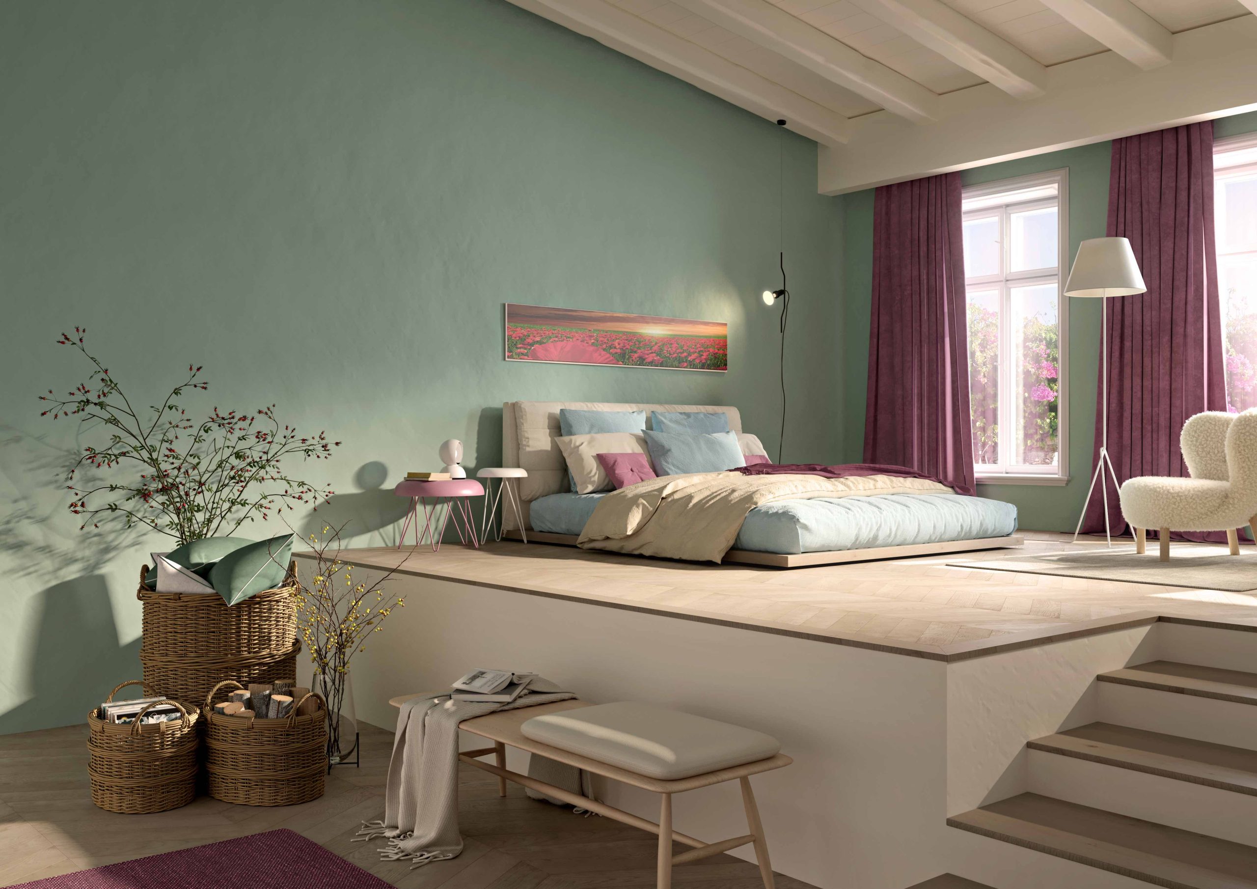 Le tre stanze che intercettano il viaggio cromatico fra gli stili di vita cui ognuno di noi sente di appartenere, conducono infine ad un nuovo portale aperto da Daydreaming, il colore dell’anno 2023 scelto da Novacolor.