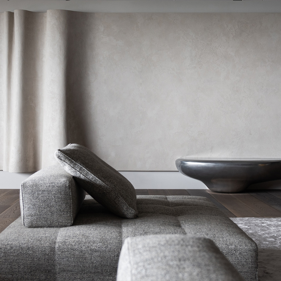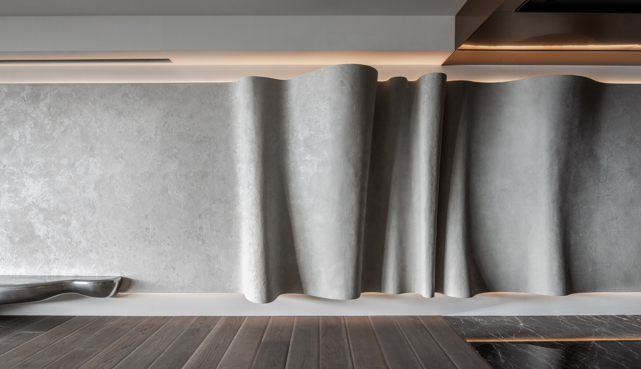 Marmur Fine, intonachino a base di calce e polveri di marmo colorati in massa a grana fine, anima la percezione dinamica della parete principale del salotto esaltandone la plasticità. Una superficie “in movimento” che ricorda l’ondeggiare di una morbida tenda che vibra grazie ad un’estetica nuvolata di grande impatto.