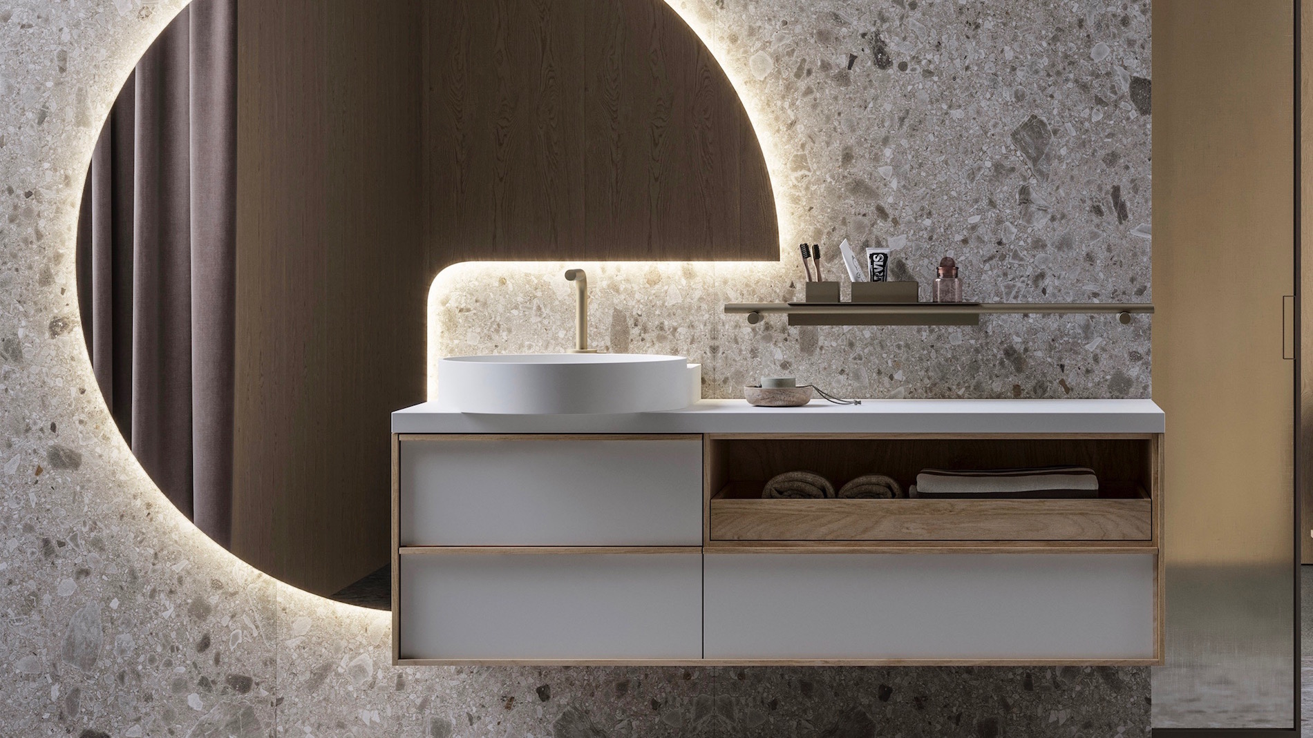La palette di colori si mantiene sui toni puri di materiali naturali, il ritmo compositivo è scandito da elementi decorativo-funzionali che si ripetono, come la barra metallica o i delicati profili in legno delle ante proposti in rovere di diverse tonalità. I materiali scelti da Cavazzana sono la pietra piasentina, il marmo grigio carnico, i laccati e il gres per abbinamenti di grande impatto estetico.