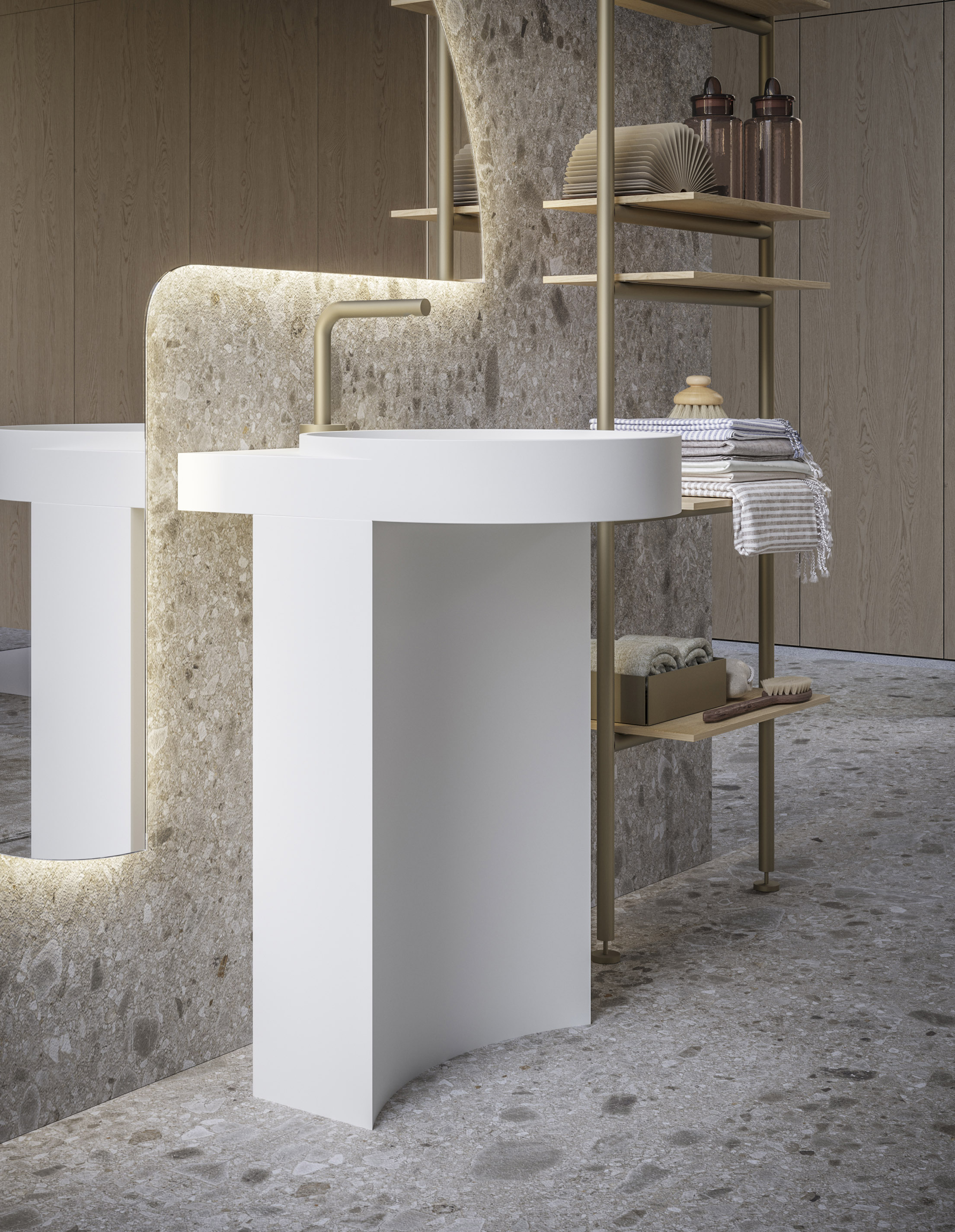 I lavabi, dal disegno originale sintesi di cerchio e quadrato, sono proposti in appoggio, integrati o free-standing in teknorit o in marmo.
