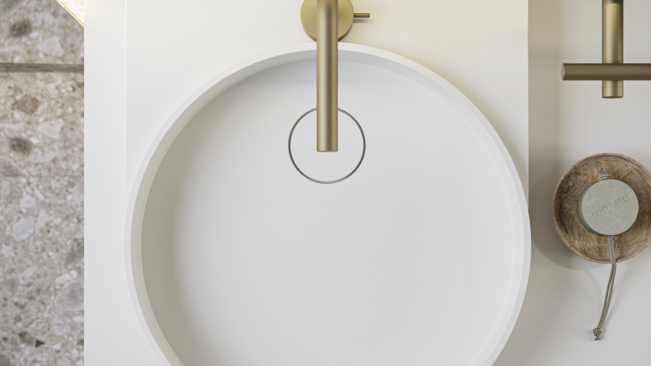 Frai è il lavabo monoblocco di Novello in Teknorit che sintetizza le linee di cerchio e quadrato, tra loro dialoganti e accostate in un originale ed evocativo disegno.