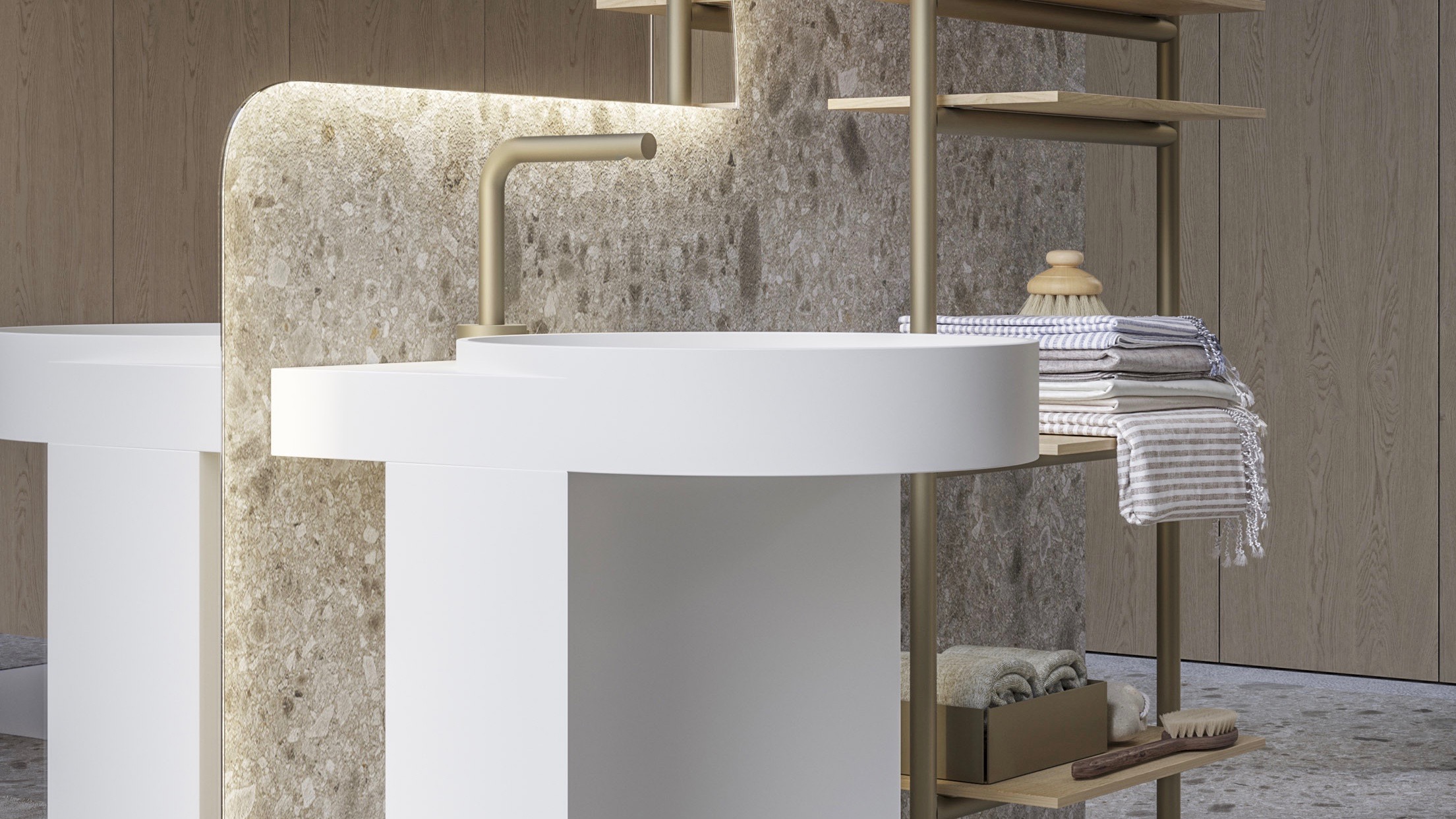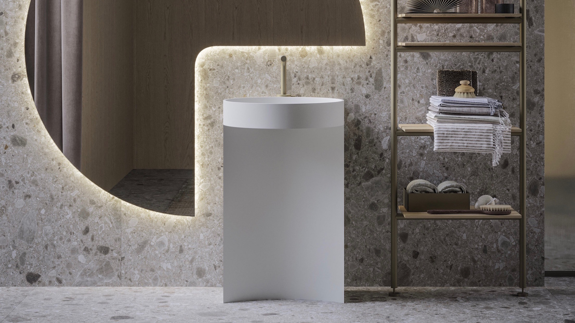 Frai, proposto nella versione in appoggio o free-standing con la particolare base a C, si integra nella collezione Sartus ispirata ad una sofisticata eleganza.