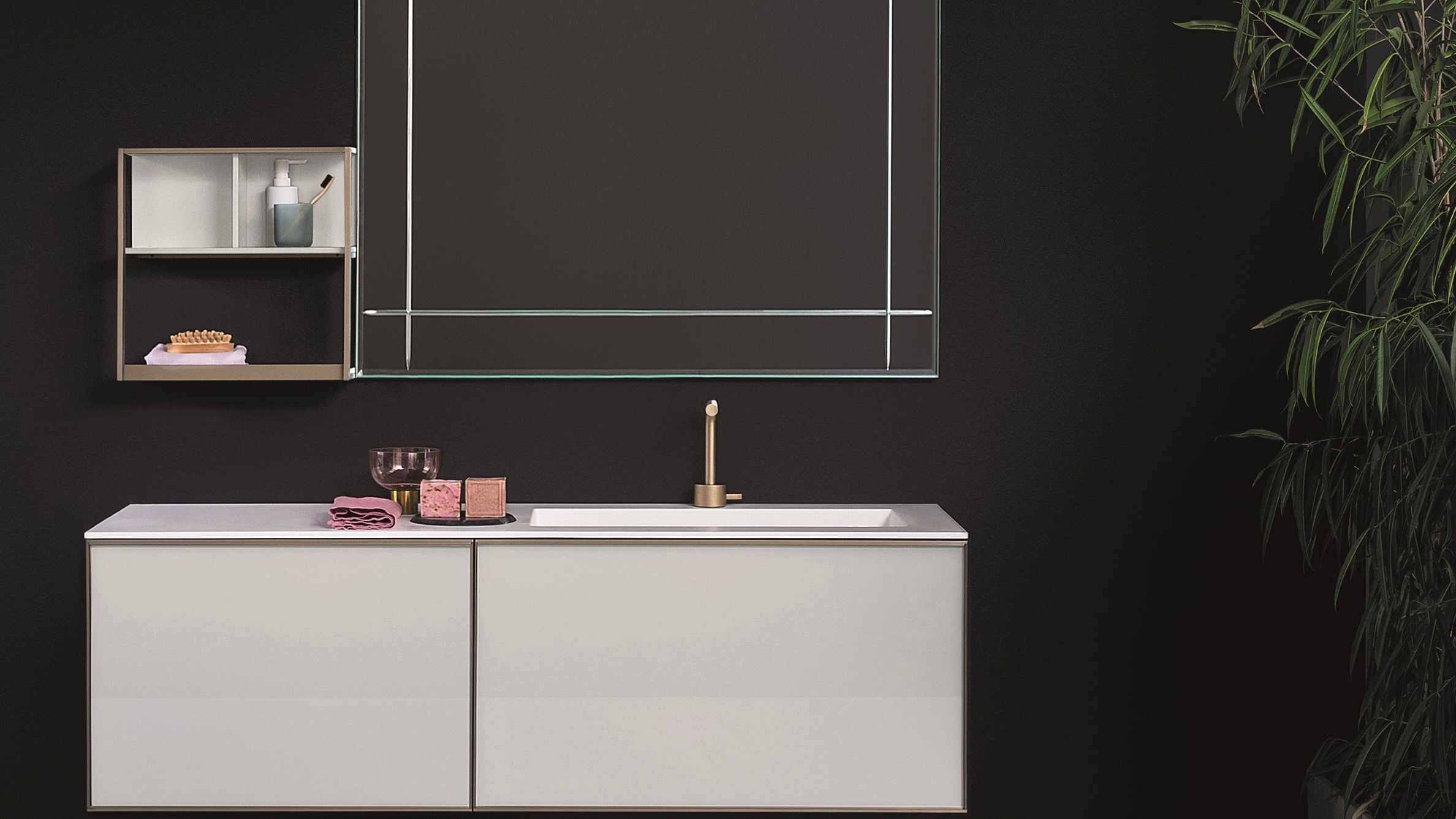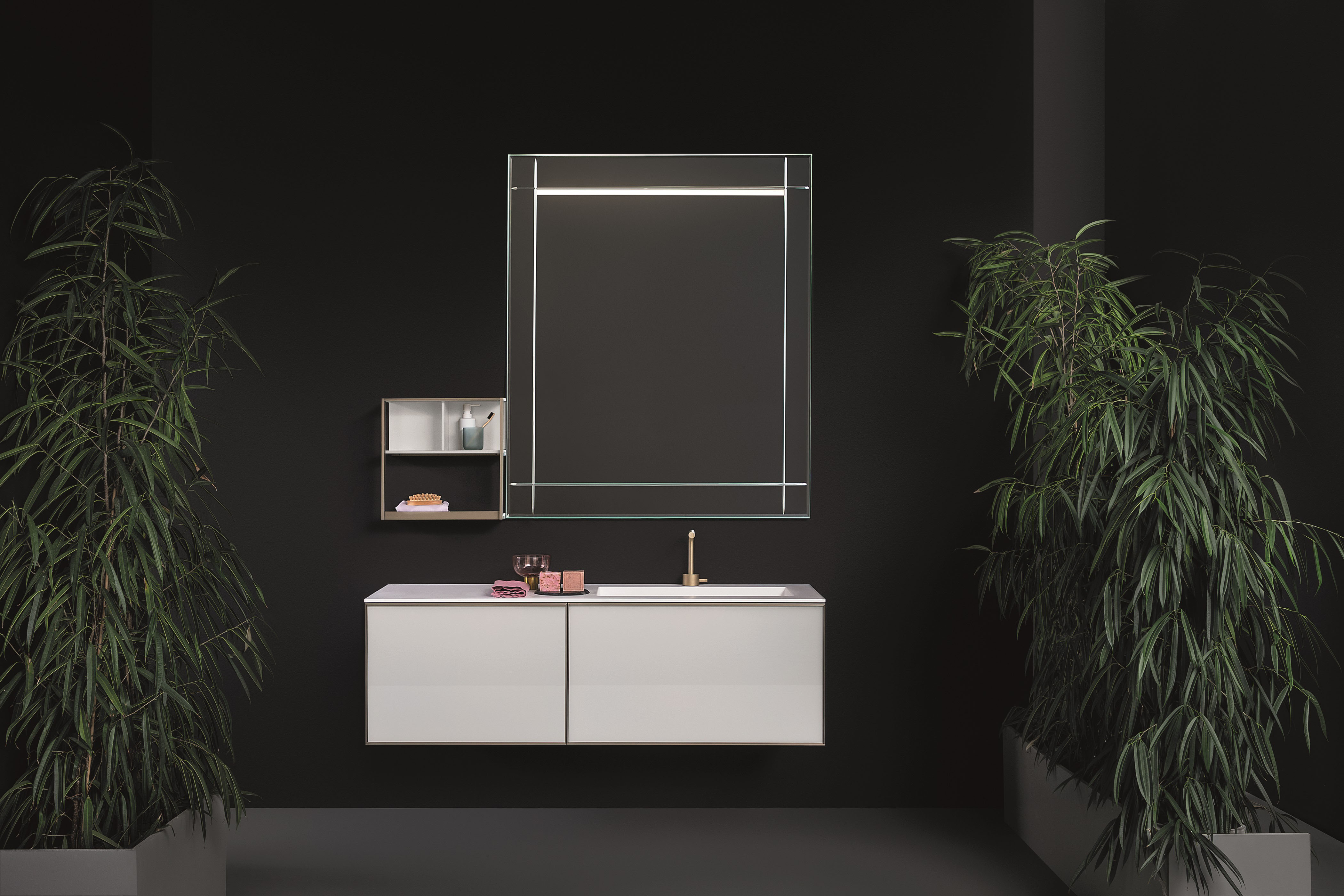 Nella collezione Quari Cannaregio (design Stefano Cavazzana) dove i perimetri disegnati da telai in alluminio con finitura Titanio incorniciano il candore del lavabo, del top, dei contenitori e delle aeree boiserie per un risultato che incanta per equilibrio e purezza.