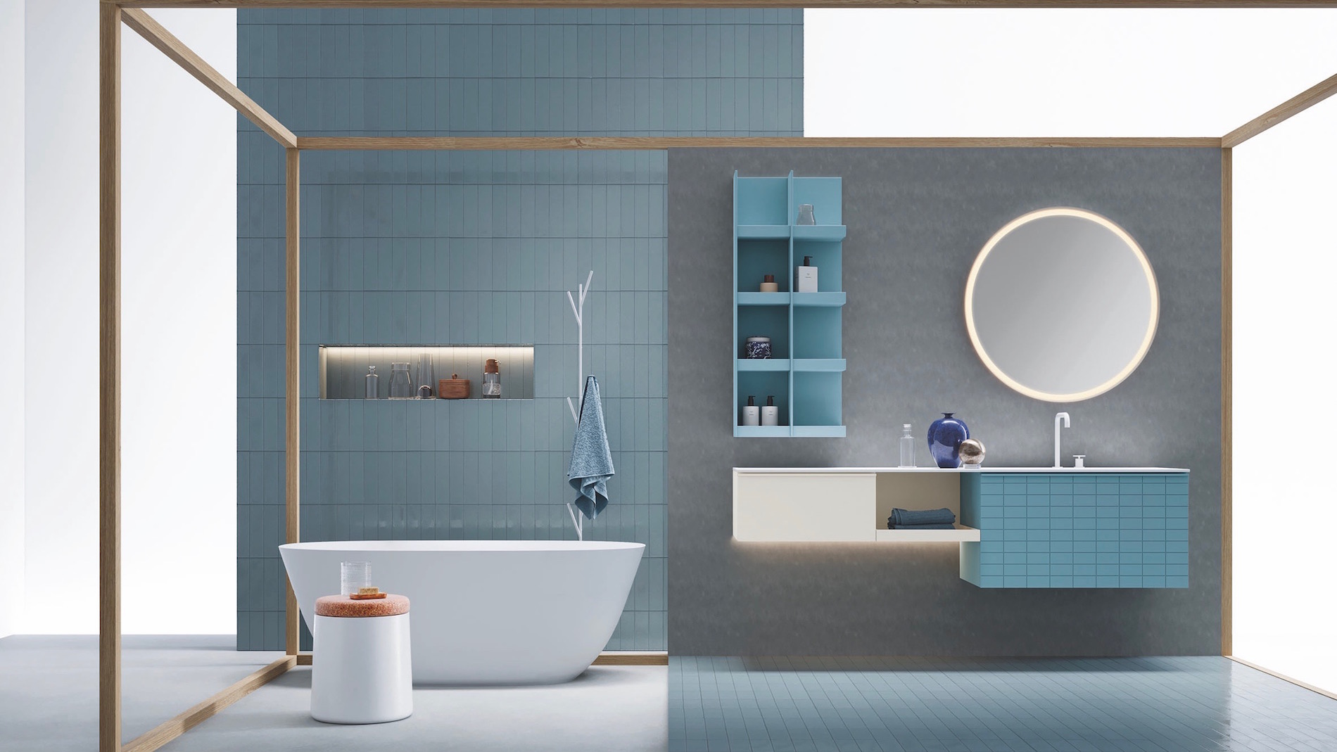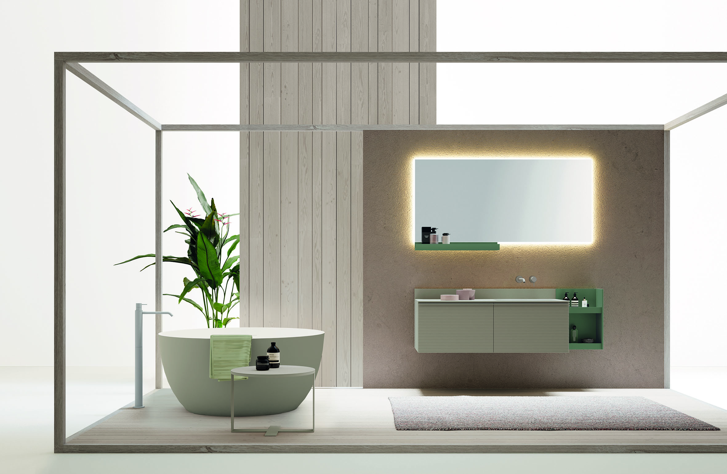 I piani con lavabo integrato sono disponibili in diversi materiali e colori, mentre una selezione di lavabi da appoggio offre ulteriori possibilità di personalizzazione. Gli specchi, curati nei dettagli, presentano una struttura perimetrale in metallo che riflette la luce in modo naturale, conferendo un aspetto sofisticato e contemporaneo ai bagni. Tra le proposte più originali spicca lo specchio “Cut”, caratterizzato da un taglio circolare che aggiunge un tocco di eleganza anche agli spazi più ridotti, completato da una lampada spostabile lungo il bordo esterno.