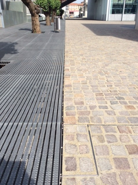 Per drenare la superficie di circa 5mila mq di pavimentazione esterna (realizzata in parte in porfido e in parte in blocchetti di legno di quercia, ricavati da vecchie traversine ferroviarie), sono stati impiegati circa 700 metri lineari di corpi canali e caditoie prodotti da Aco, scelti per le caratteristiche tecniche e per la linea estetica, dal design essenziale e minimale, in armonia visiva con il contesto architettonico circostante.