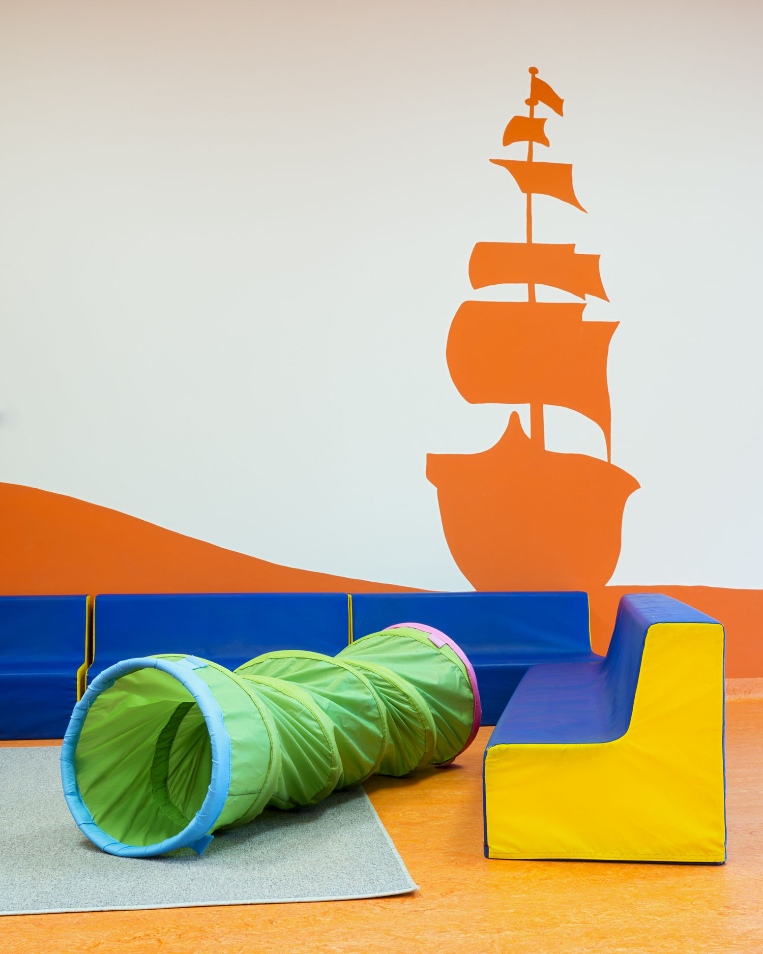 I colori delle pavimentazioni delle zone didattica e dormitorio sono stati coordinati con le decorazioni alle pareti, per cui il corridoio nel seguire il motivo del bosco presenta una colorazione in verde…come si camminasse su un prato, mentre per le aule e la sala attività libere si sono scelti colori accesi, in linea con i temi decorati. Il dormitorio ha invece colori e decori studiati per il riposo, con pavimentazione azzurra e blu e decori su pareti e soffitto in medesime tonalità.