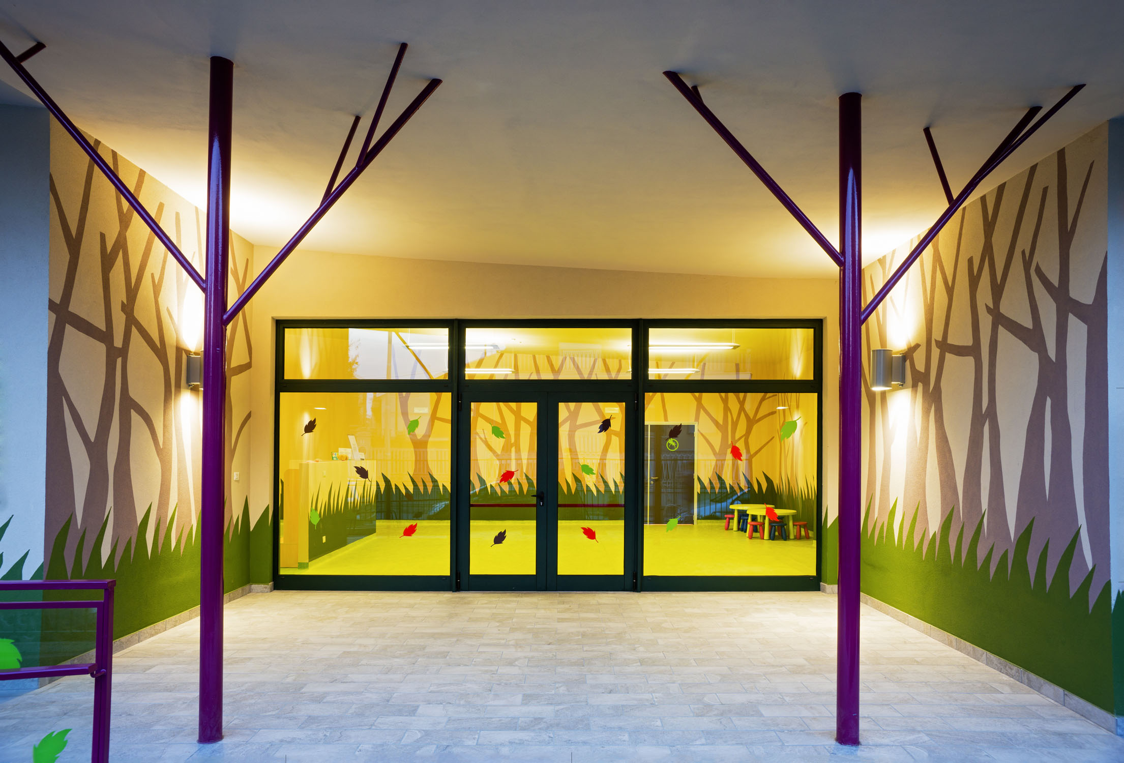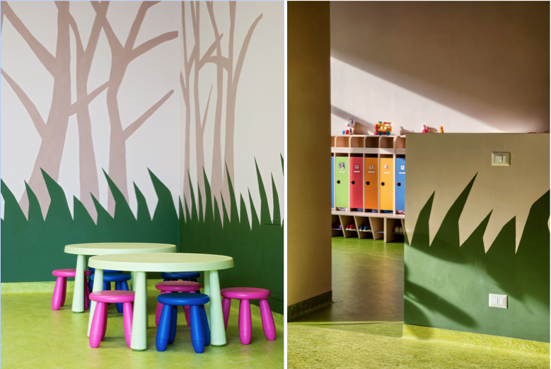 Il tema del bosco permea anche l’interno della costruzione, sia nell’atrio, dove si viene accolti da un piccolo bosco incantato, che in tutto il corridoio longitudinale della struttura, decorato con erba spinta dal vento, ad accompagnare i piccoli nei loro spostamenti quotidiani.