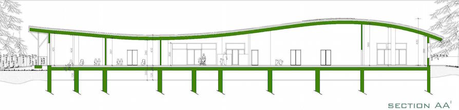 L’edificio, infatti, volutamente stringe uno stretto rapporto con il paesaggio naturale che lo circonda, trovandosi al centro di un’area verde contornata da alberi ad alto fusto, e offre un dialogo fra spazi interni ed esterni attraverso la trasparenza della sagoma, realizzata da pareti ricche di vetrate. I caratteristici decori esterni rafforzano il tema predominante del bosco.