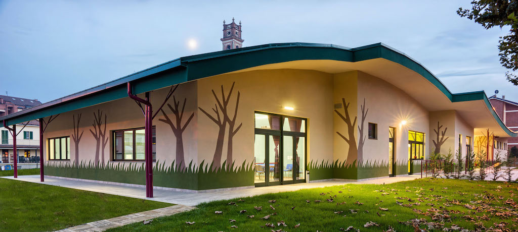 L’importante copertura con forma ad onda, elemento caratterizzante il nuovo volume, è stata pensata e voluta come elemento di distinzione della nuova struttura, immaginata come una grande chioma verde, sostenuta idealmente da alberature metalliche e da alberi decorati. I muri perimetrali che avanzano e indietreggiano a creare movimento nei prospetti, insieme alla presenza di strutture metalliche ramificate nelle parti aggettanti del solaio di copertura, concorrono ad offrire una particolare valenza architettonica ed estetica al progetto, creando un gioco di ombre molto simili a quelle di un sottobosco. L’idea della natura ritorna all’interno della struttura, grazie ai decori a tema: le decorazioni degli interni si declinano per tipologia di utilizzo degli spazi, portando i piccoli ospiti nel mondo delle favole.
