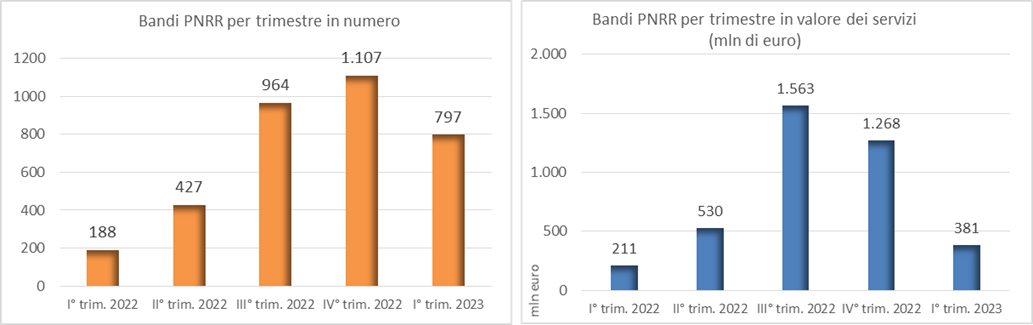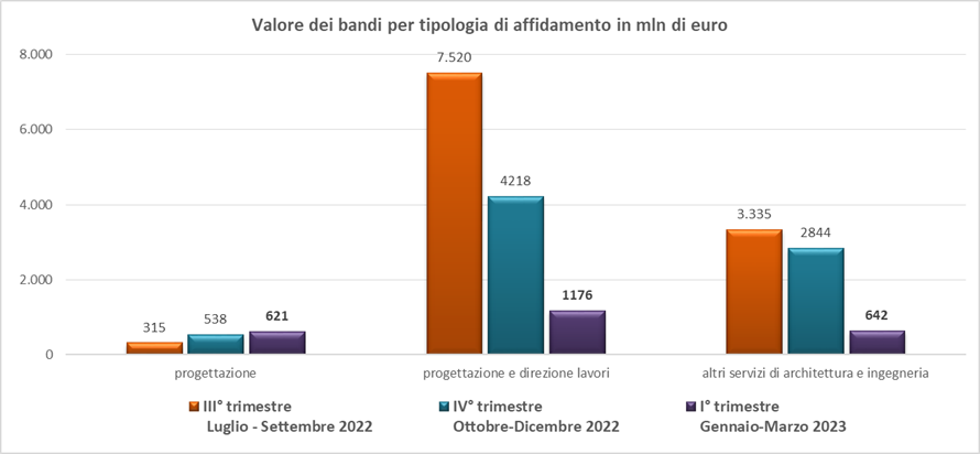 Nel periodo gennaio-marzo 2023 sono stati infatti pubblicati 797 bandi per un valore di servizi di 381 mln di euro che attiveranno 7.1 mld di lavori. In particolare i bandi di sola progettazione sono stati 226, il 28,4% del numero totale dei bandi Pnrr emessi, con un valore di servizi di 62,0 mln, il 16,3% del valore totale.