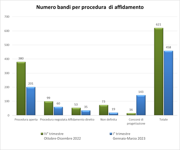Va segnalato il dato, significativo, relativo al numero dei concorsi di progettazione: 143 bandi emessi, il 31,2% del numero totale, relativi ad un importo di servizi e premi per un pari a 40 mln, il 16,5% del totale del valore. Il confronto dell’andamento dei concorsi tra il primo trimestre 2023 e il quarto trimestre 2022, è nettamente positivo: +793,8% nel numero dei bandi pubblicati e +405,8% nel valore dei servizi.