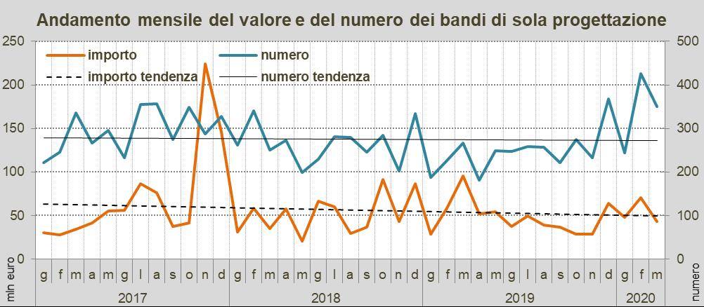 Per la sola progettazione, nel primo trimestre 2020 il numero dei bandi è stato di 1.021 bandi per un valore di 161,2 milioni di euro: +49,7% in numero ma -11,7% in valore sul primo trimestre del 2019. Nel grafico si evidenzia per la prima volta una discesa nella linea di tendenza del valore.