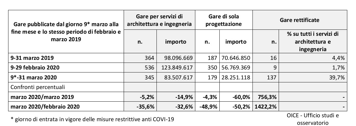 Per cercare di comprendere meglio le dinamiche del mercato in questa situazione di crisi Oice ha approfondito il dato delle gare rettificate (cioè con scadenza delle offerte prorogata, con sospensione della gara o con annullamento del sopralluogo): dal 9 marzo– giorno di entrata in vigore delle misure restrittive anti Covid-19 su tutto il territorio nazionale- al 31 marzo 2020 sono state oggetto di modifica 176 procedure di affidamento che comprendono attività di progettazione, altri servizi tecnici, e affidamenti di progettazione insieme a lavori. Si tratta di un dato rappresentativo del 31,5% del totale delle 558 gare pubblicate negli stessi giorni.