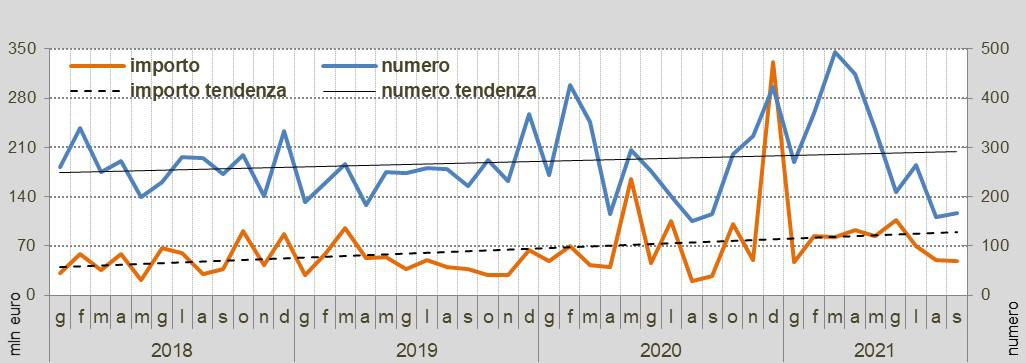 Nei nove mesi dell’anno sono stati pubblicati 413 appalti integrati, con un valore complessivo di 5.424,4 milioni di euro, +31,1% in numero e 40,1% in valore sui nove mesi del 2020; il valore complessivo dei servizi di architettura e ingegneria compreso è di 141,3 milioni di euro, e crescono del 69,8% rispetto ai primi nove mesi del 2020.
